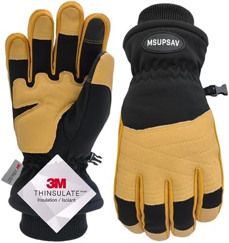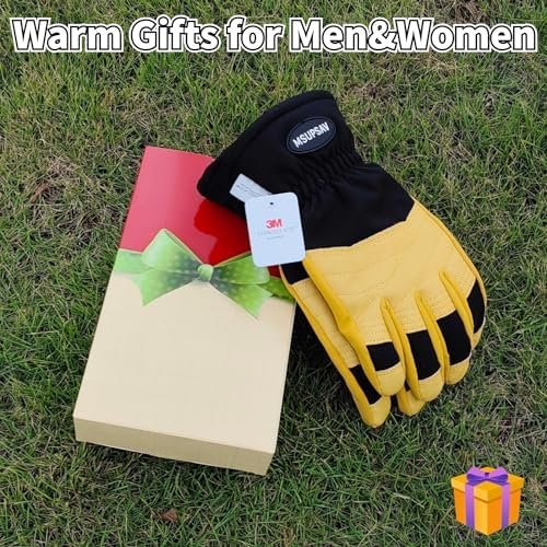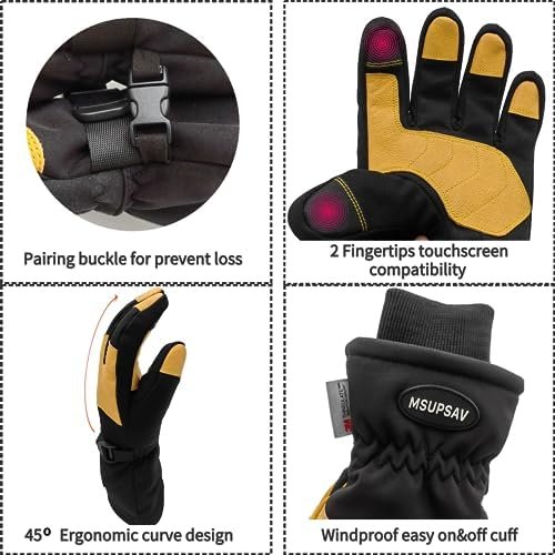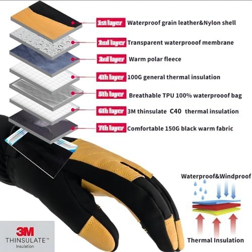 [HIGH DURABILITY AND ABRASION RESISTANCE WATERPROOF WORK GLOVES]➤Waterproof work gloves premium Anti-slip grain leather palm and back of hand both of padded offers enhance grip and long-lasting durability to add extra protection and resistance to wear.The part between thumb finger and the index is reinforced with grain leather to protect against thumb joints pain in grip and ensures durability.Durable fabric on the back for ensures safety during skiing, cycling,driving and working.