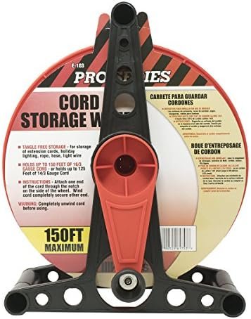 Designers Edge E103 Cord Storage Wheel, Red. Use for extension cords, holiday lights, rope, light wire, coax cabling, and more. Ideal for general storage of extension cords, holiday lights, and rope. Holds up to 150-feet of 16 gauge cord or 125-feet of 14 gauge cord. To operate, hold handle steady at the top of the reel, pull rotating lever to move cord reel in desired direction. Holds up to 150-feet of 16/3 gauge cord when guided neatly – if thicker cord, less length will be organized. Recommend to set on ground while wrapping cord. Convenient handle allows you to unwind your cords quickly for easy access. The Designers Edge (R) brand is a registered trademark of Coleman Cable Inc.