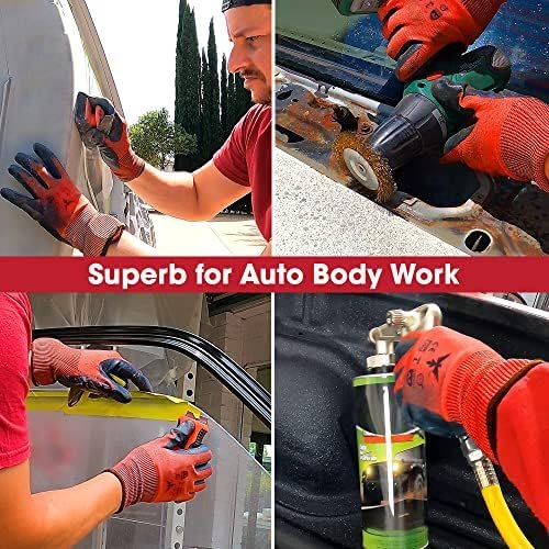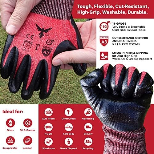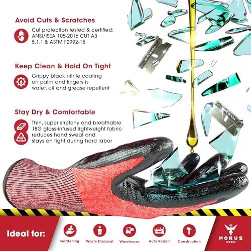 STOP REPLACING FLIMSY WORK GLOVES; these are durable and reliable working gloves for men and women alike. Perfect for automotive as mechanics gloves, compact gardening gloves, landscaping; warehouse work and more. Comes as one pair or in bulk pack; these nitrile coated cut resistant gloves are oil resistant and cut proof making them perfect for most jobs. Very high hand mobility thanks to the advanced G18 glass fiber weave – thinner, lighter and stronger than regular womens or mens work gloves