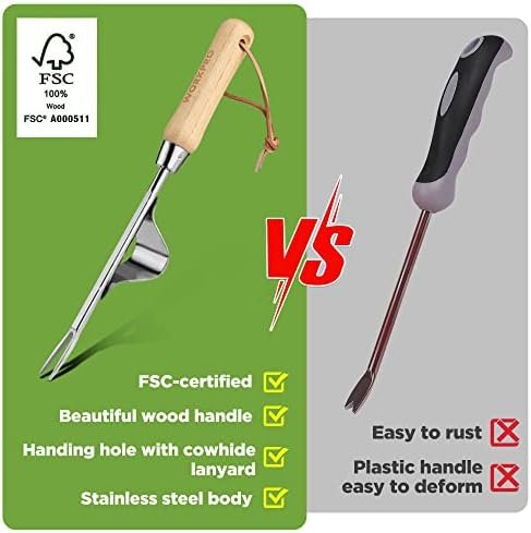Comfortable Wooden Handle: The optimum strength and premium grip allow for easy wrist movement and reduces hand fatigue while working. The weed removal tools with ash hardwood handle from FSC Certified sustainable forests, promoting sustainable forestry practices. We’re committed to a greener environment.