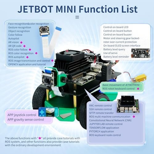 【AI robotic for Jetson Nano 4GB】Jetbot mini uses Python3 as programming language, built-in ROS robot operating system, and openCV as the image processing library. It is an entry-level ROS developed robot based on 4GB.4GB has more powerful GPU than Raspberry Pi, more cost-effective than Jetson nano 4GB. It is the best choice for AI & ROS to start exploring.