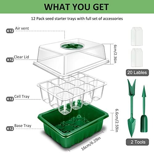 Cover All You Need: The best choice for planting beginners. You will get 12 x seed tray, 12 x watertight base tray, 12 x lid with adjustable window, 20 x plant labels, 2 x small garden tools.